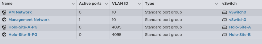 Remarque : Holodeck est capable de simuler une configuration multi-site, c’est pour cela que je crée deux vSwitch (un par site).