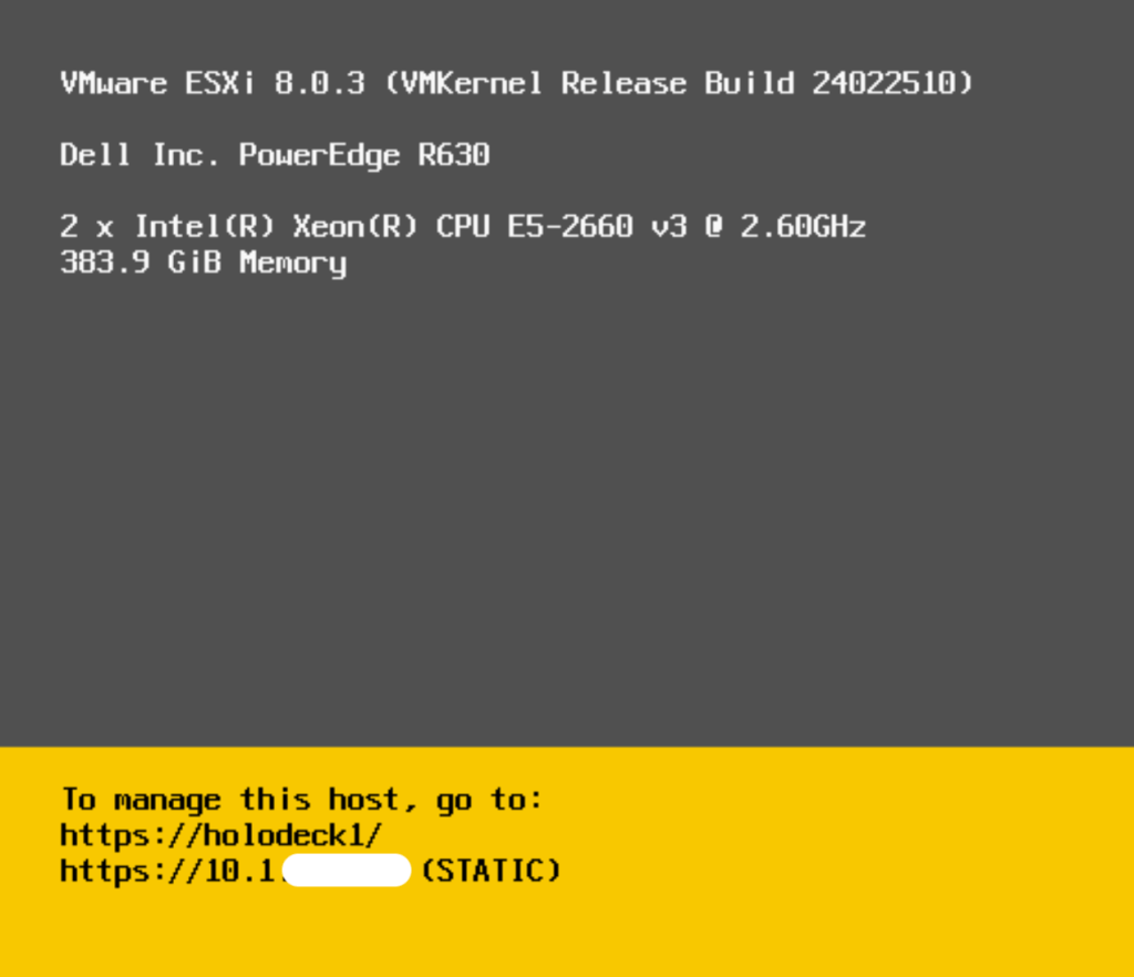 Le serveur possède une carte de management idrac, je monte donc l’iso avec le virtual media et j’installe la dernière version d’ESX. Si votre serveur est une pièce de musée comme mon Dell R630, il faudra forcer l’installation car le CPU n’est plus supporté en vSphere 8.0U3.