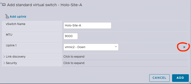 On crée le premier vSwitch : Holo-Site-A, on passe le MTU à 9000 (obligatoire sinon le déploiement plantera) et on supprime l’uplink.