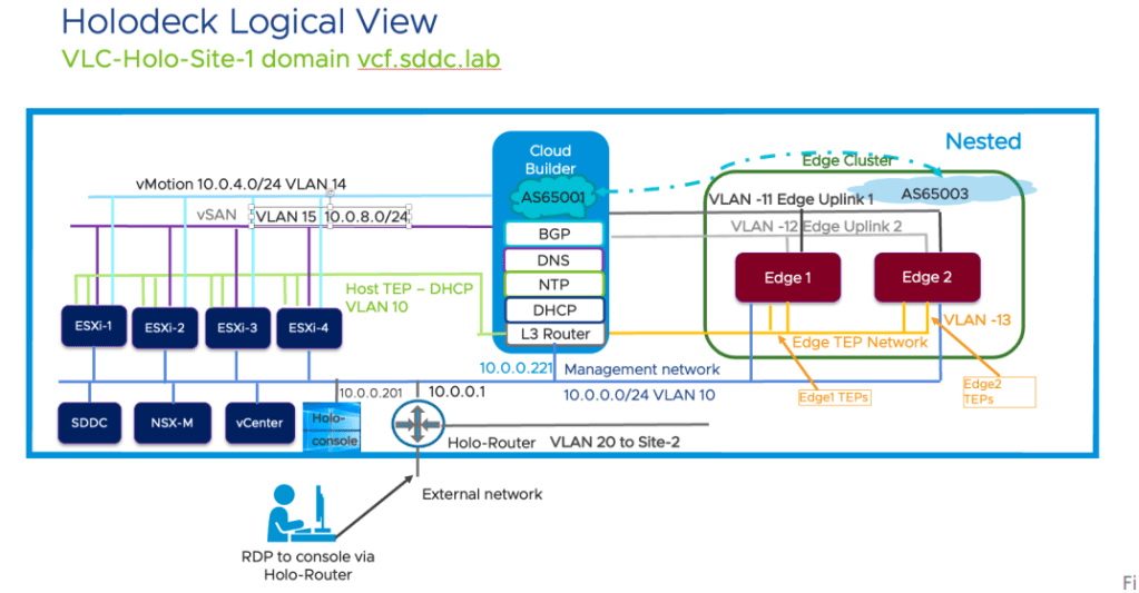 Dans un environnement classique le Cloud Builder est l’appliance qui permet de déployer l’environnement VCF, on peut d’ailleurs l’éteindre et la supprimer une fois le déploiement terminé. Dans un environnement Holodeck VCF, il a un rôle bien plus important car on s’en sert pour le déploiement mais aussi comme routeur, serveur DNS, NTP et DHCP, il doit donc rester allumé post déploiement.