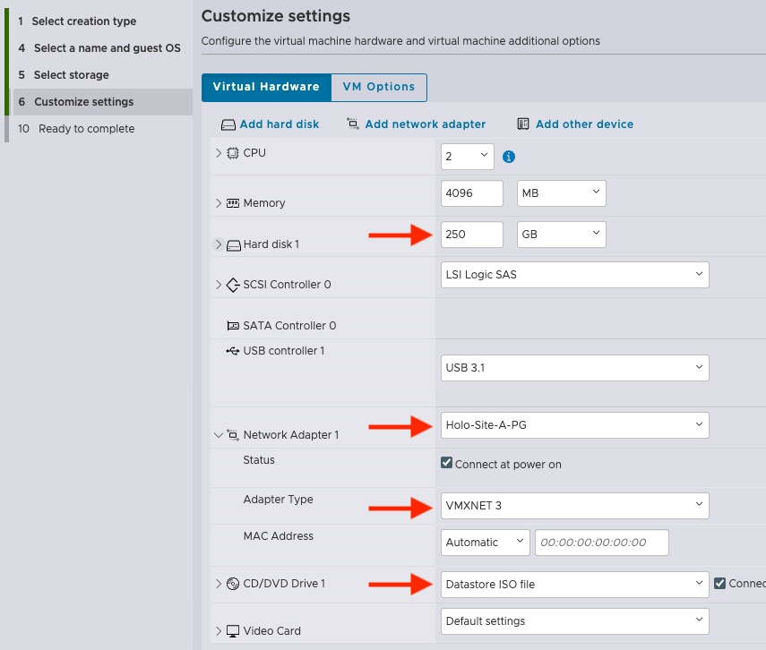 - Il faut connecter la VM sur le port group Holo-Site-A-PG que l’on a crée dans la partie 1 du guide.
