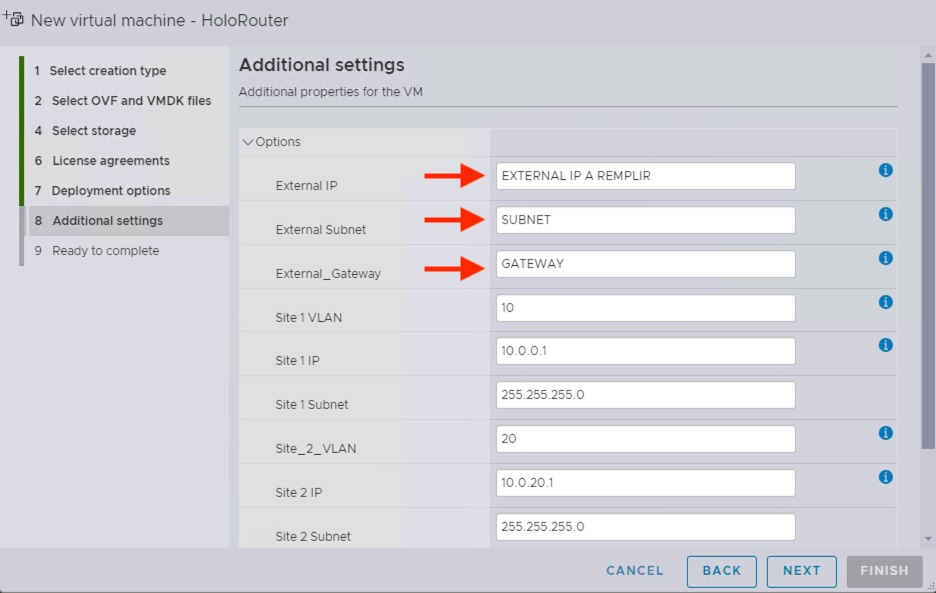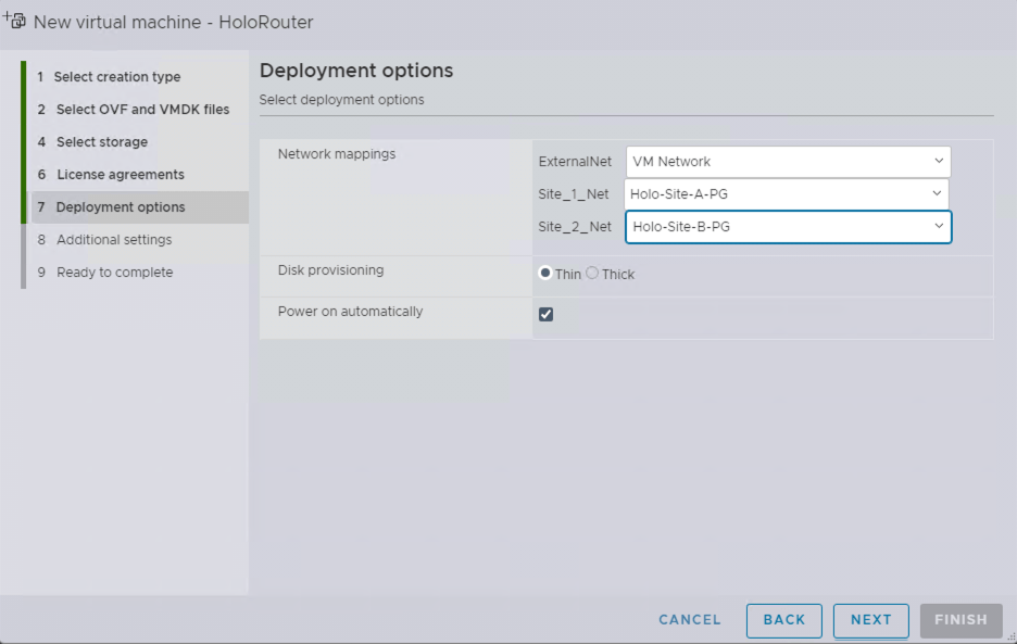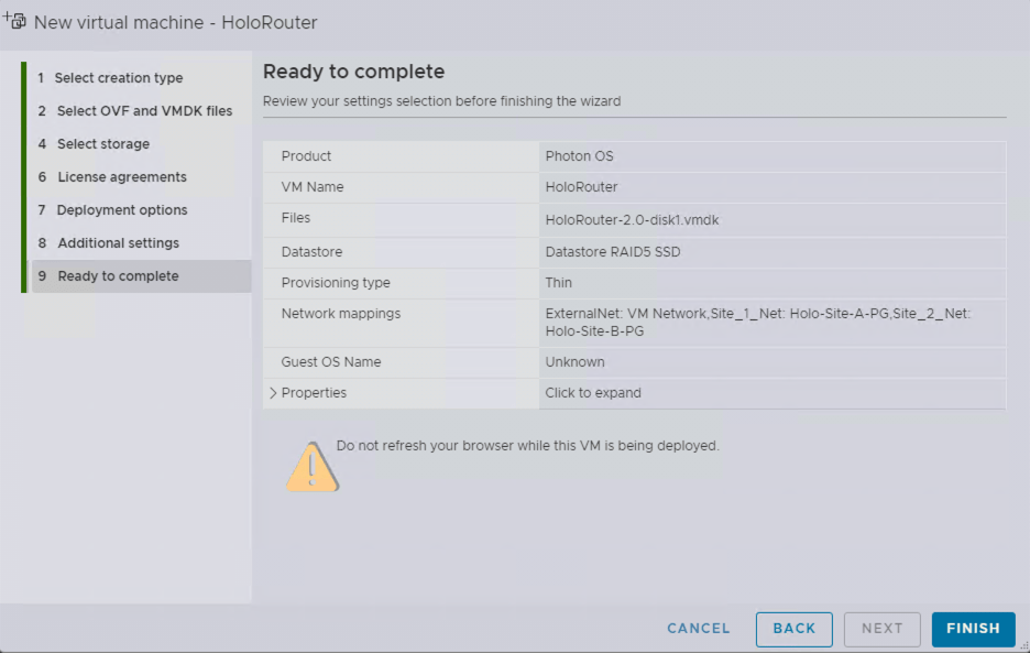 Le Holo-Router est le point central de notre futur infrastructure, cette VM basé sur du Photon OS fait la connexion entre le monde VCF Holodeck et l’environnement extérieur. Pour faire simple, il a une patte externe sur votre réseau LAN, une patte interne sur le Port Group Holo-Site-A-PG et une autre patte sur l’autre Port Group Holo-Site-B-PG. Son déploiement est relativement simple comme nous le verrons dans la suite du guide.