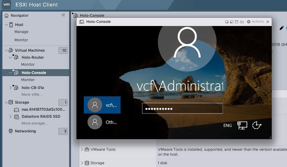 La Holo-Console est notre passerelle Windows 2019 pour se connecter sur l’infra VCF. Holodeck a été pensé pour fonctionner en vase clos, il est donc impossible de se connecter directement depuis votre poste au SDDC Manager, au vCenter ou aux ESX.
