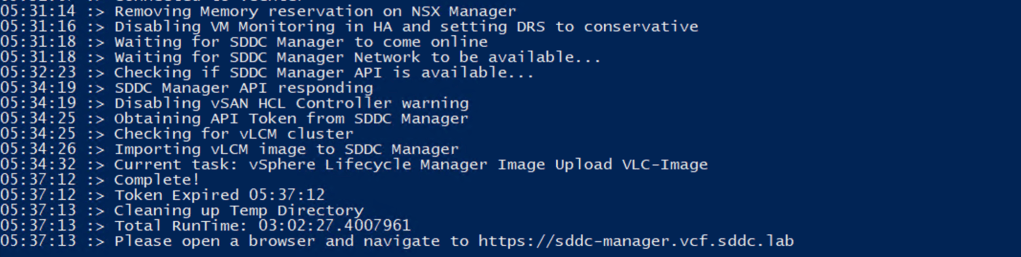 Vous devriez terminer sur un message vous invitant à vous connecter à votre SDDC Manager