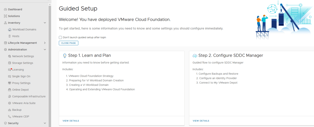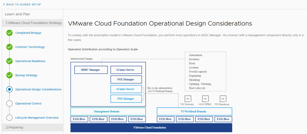Lors de la première connection, vous avez un Guided Setup en deux étapes. La première est purement informative, je vous conseille de la parcourir si vous êtes débutant sur VMware Cloud Foundation :