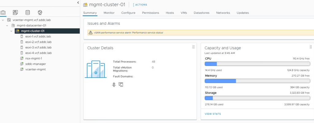Le cluster qui porte ces VMs est un cluster vSAN de 4 noeuds. Les fonctionnalités vSphere HA et DRS sont activés. NSX est déployé mais pas encore utilisé. Vous avez ici le minimum du minimum d’une architecture VCF.