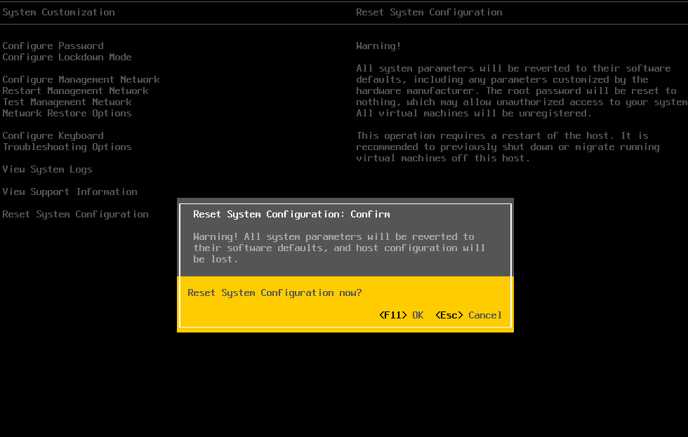 Une fois installé, on se connecte à la console et on fait un reset de la configuration System : c’est un moyen rapide de « dépersonnaliser » un ESX et d’être sur qu’au moment de le cloner, on aura bien un comportement similaire à un template générique.